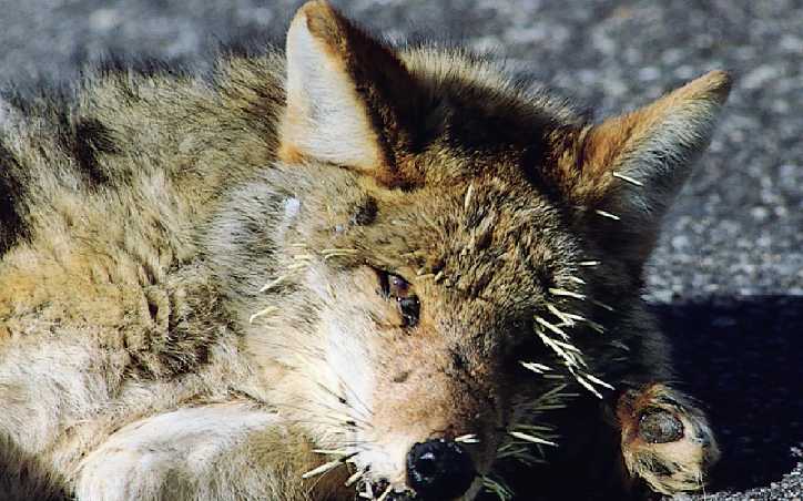 The consequence of chasing a porcupine is a face full of quills, so this coyote may learn to avoid this behavior in the future.